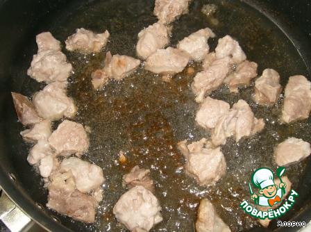 Мелко нарезаем мясо и обжариваем немного в раскаленном масле.