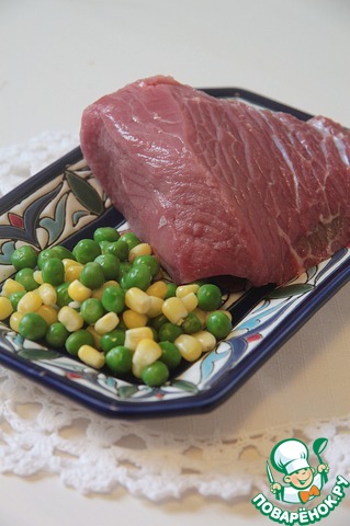 Для этого блюда нам понадобится кусок телятины. Это отличное диетическое мясо, которое прекрасно усваивается. А еще нам будут нужны размороженные овощи - у меня зеленый горошек и кукуруза. Не стоит брать консервированные, т. к. от них нет пользы, а лишняя соль нам не к чему :)