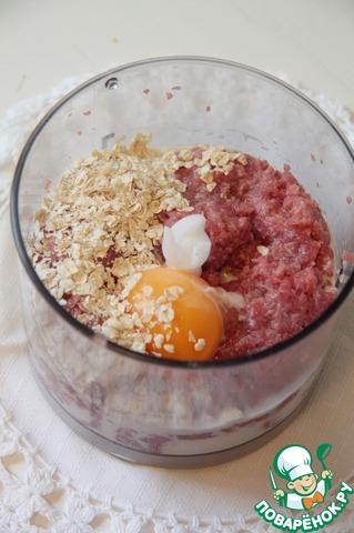 Измельчаем телятину в блендере, отделяем желтки от белков, к мясо добавляем желток, овсяные хлопья и молоко. Все перемешиваем.