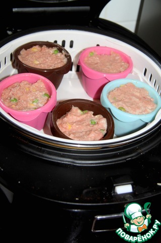 Наливаем в мультиварку воду - 4 стакана, которые идут в комплекте к мультиварки, ставим сверху форму для приготовления на пару, выкладываем наши формы с суфле.