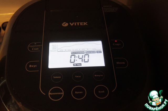 Выбираем программу на пару и время 40 минут. Теперь у Вас есть время для себя, т. к. о готовности блюда эта умная машина сообщит Вам приятным мелодичным звоном :)