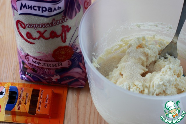 Творог растереть с яйцом, миндальной эссенцией и сахаром.