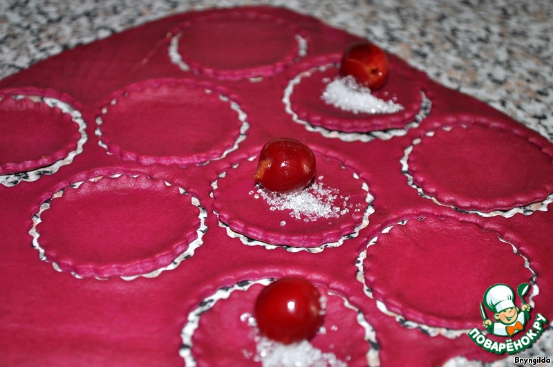 Приготовим тесто, как здесь http://www.povarenok.ru/recipes/show/66653; у меня осталось тесто от пасты, оно лежало ночь в холодильнике в пленке, цвет стал немного темнее и ярче. Раскатала и вырезала маленькие кружочки формочкой для печенья. Посыпать в каждый кружок сахар и положить одну вишенку.