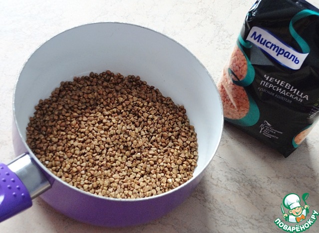 Отмерить и промыть гречку. Залить двумя стканами воды и варить до готовности. Гречка варится дольше чечевицы, поэтому ее ставим вариться первой.