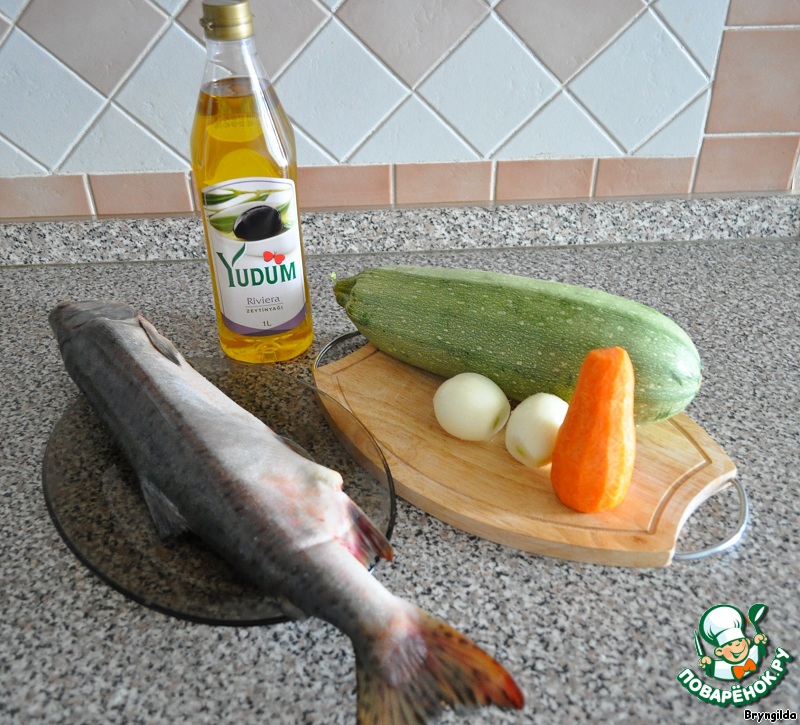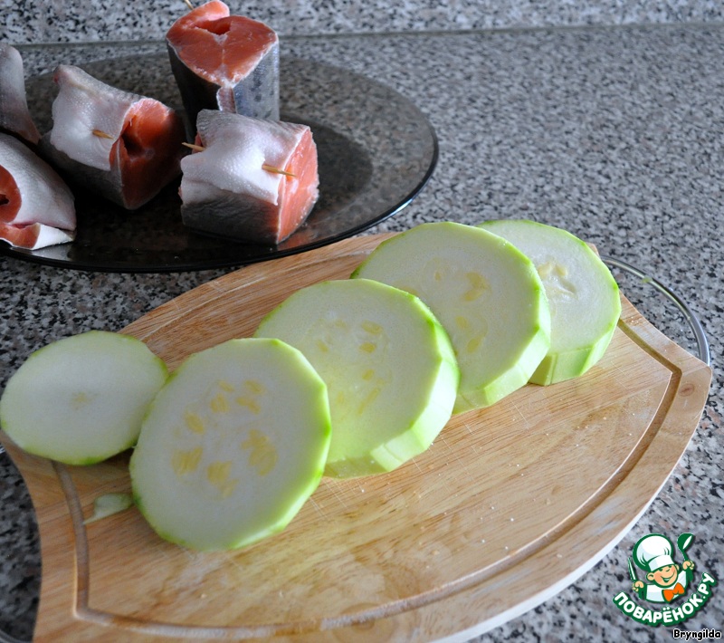 Кабачок режем толстыми колечками и на них кладем по кусочку рыбки. Кольца кабачков можно натереть чесночной солью или просто посолить.