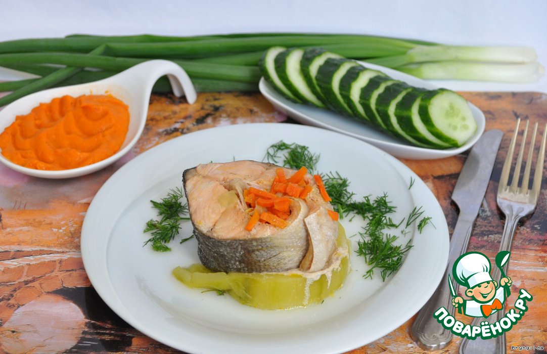 Рыбу я брала горбушу, она самая нежирная из лососевых, вы можете выбрать любой другой сорт красной рыбы. Драма разыгралась, когда муж почистил рыбу и вспорол ей брюшко! А этого делать не надо, надо порезать рыбу на кусочки не вспарывая брюшко и вынуть внутренности, тогда у вас получится естественное колечко из рыбы, а мне пришлось закалывать брюшко зубочистками. То же Вам надо будет сделать, если Ваша рыбка будет крупная и, чтобы колечко было среднего размера, Вам придется разрезать брюшко и заколоть зубочисткой.