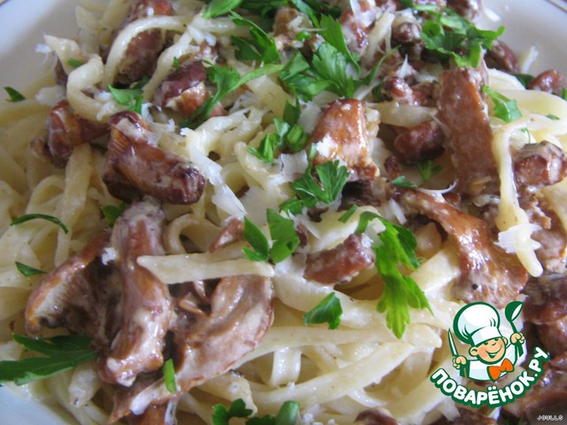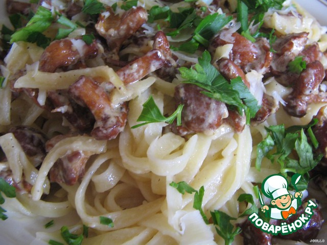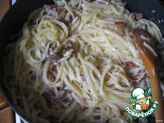 Готовые тельятелли перекладываем в сотейник к грибам и прогреваем.