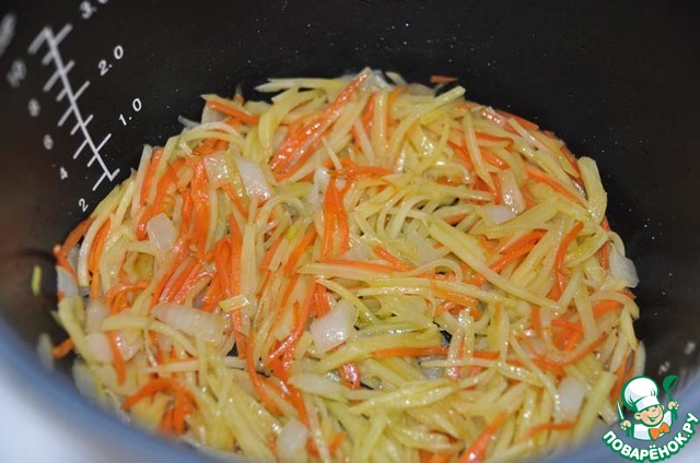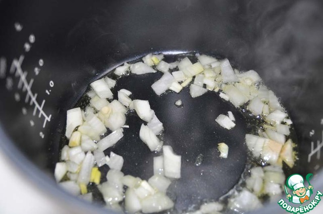 Включаем мультиварку на режим "Поджаривание", в чашу наливаем растительное масло.
