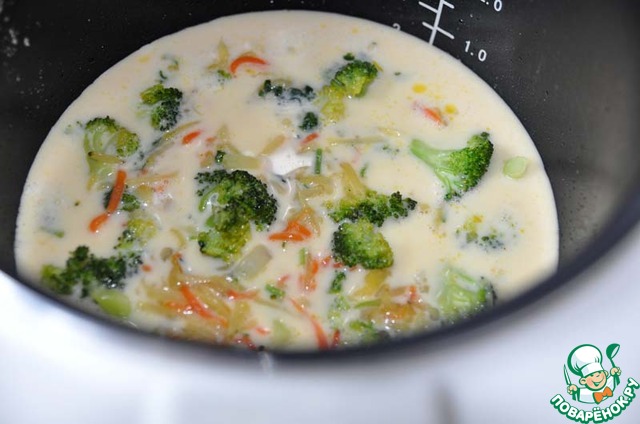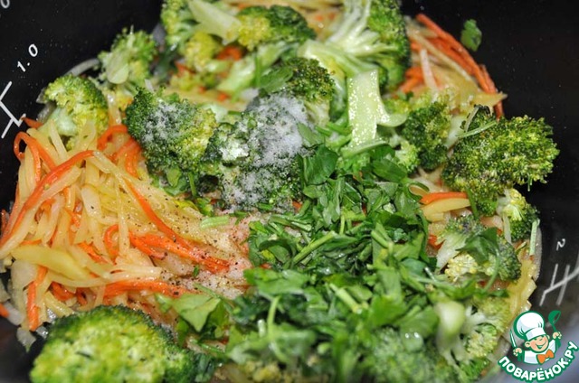 Добавляем разобранную на соцветия брокколи. Можно брать как свежую, так и замороженную.
