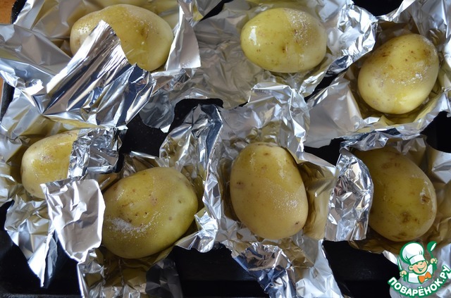 1. Каждую картофелин обмазать подсолнечным маслом, посолить и поперчить, туго завернуть в фольгу и запечь до готовности.