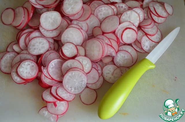 3. Редиску порезать тонкими кругами.