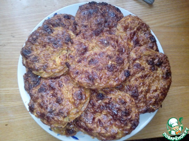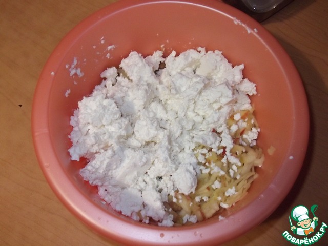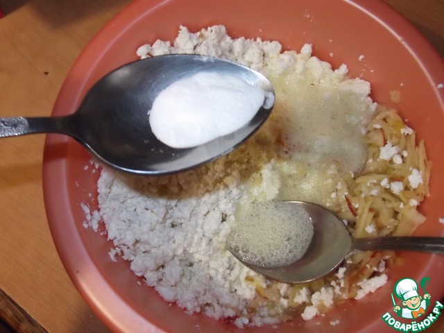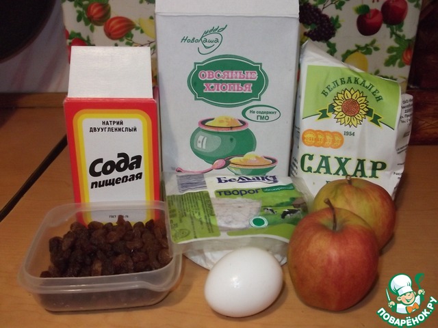 Берем обезжиренный творог, овсяные хлопья, яйцо, соду, сахар (лучше мед), яблоки, изюм.