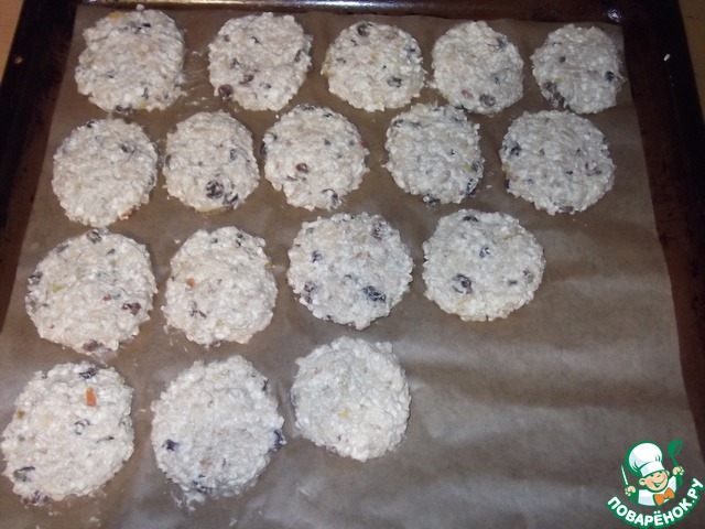 Изюм слить и добавить в тесто. Перемешать. Оставить тесто настаиваться на минут 30, для разбухания овсяных хлопьев.