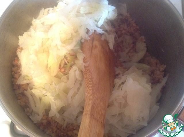 Выкладываем нашу капусту поверх гречки, шапкой. Ни в коем случае не перемешиваем!