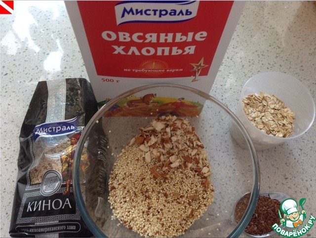 Смешиваем киноа (предварительно я его промыла и высушила), кунжут, семена льна, овсяные хлопья, соль, специи и оставшийся крупно нарубленный миндаль.
