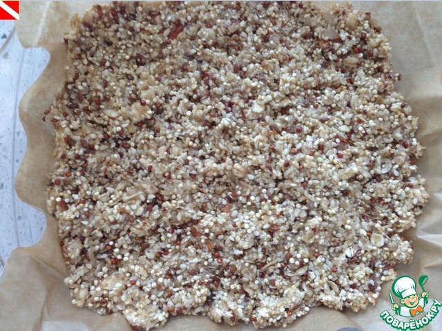 Смешиваем сухие и влажные ингредиенты вместе - получается очень густая масса. Выкладываем ее в застеленную бумагой форму ( у меня 15*15 см) и ставим в предварительно разогретую до 180 градусов духовку.