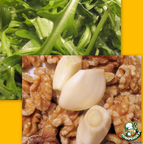 Грецкие орехи слегка прокалить на сковороде. Чеснок очистить и мелко порезать. Рукколу перебрать, отрезать "ножки" листьев (в них много канцерогенов), промыть и просушить.