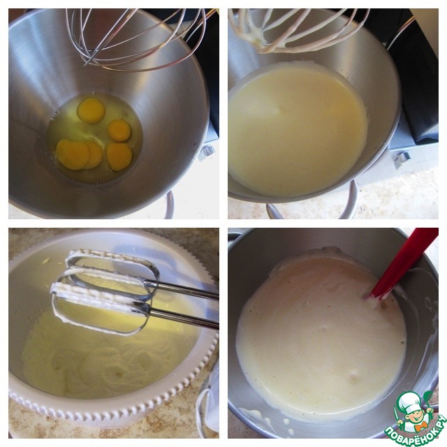 Яйца взбить с 1/2 стаканом сахара, ванильным сахаром в пышную пену. Сливки взбить до состояния мягких пик. Соединить взбитые яйца и сливки, аккуратно перемешать. Количество сахара регулируйте по своему вкусу!