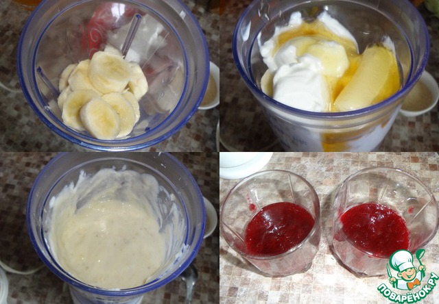 Бруснику с 1с. л. мёда измельчить ручным блендером до состояния пюре (фото оказалось не в фокусе). Взять два стакана, положить на дно брусничное пюре и сверху аккуратно вылить банановый смузи.