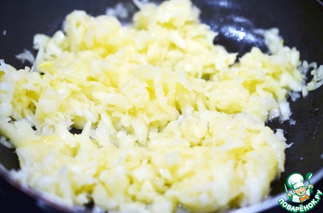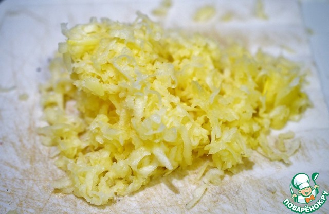 Кабачок почистить, натереть на крупной терке. Чеснок очистить и мелко нарезать.