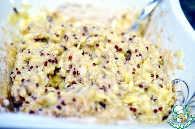 Соединить кабачок, киноа, добавить муку и яичную смесь. Все тщательно перемешать. На разогретую сковороду с оливковым маслом ложкой выкладываем блинчики и обжариваем по 2 минуты с каждой стороны.