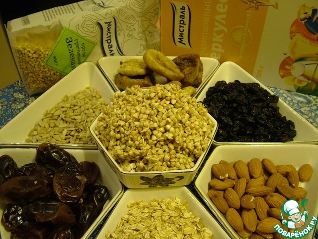 По объему "сухих" ингредиентов (проростки, хлопья, орехи и семечки) должно быть примерно столько же, сколько "связующих" (сухофрукты) или чуть больше.
