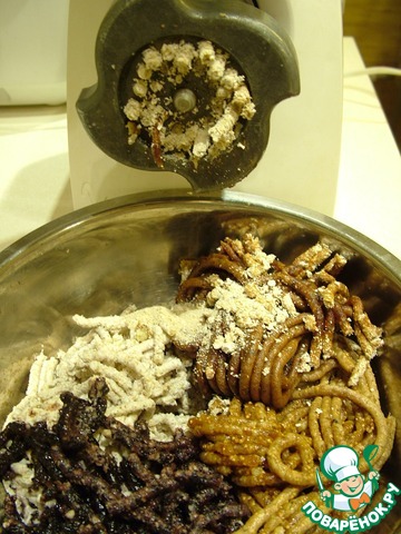 Я перемалываю через мясорубку половину гречки, хлопьев, орехов, семечек, изюма, фиников и весь инжир. Оставшееся добавляю чистом виде, для более красивой и интересной структуры.
