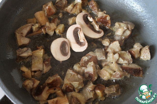 Белые грибы у меня замороженные, а шампиньоны свежие порубила кусочками и обжарила в оливковом масле