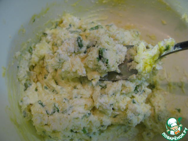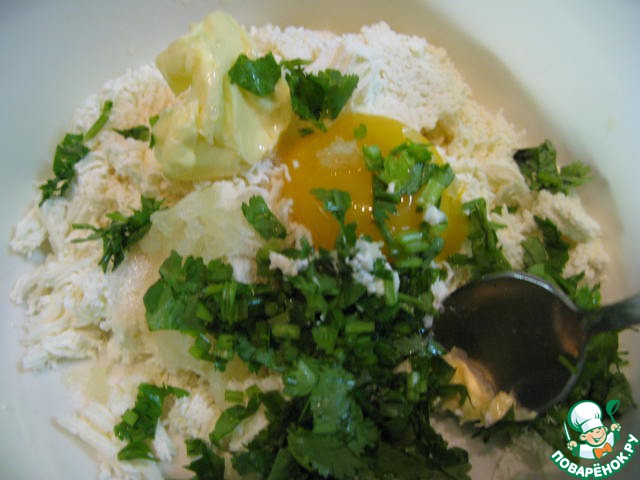 Добавить желток, размягчённое сливочное масло (1 ст. л.), сахар, соль, нарезанный чеснок и зелень.