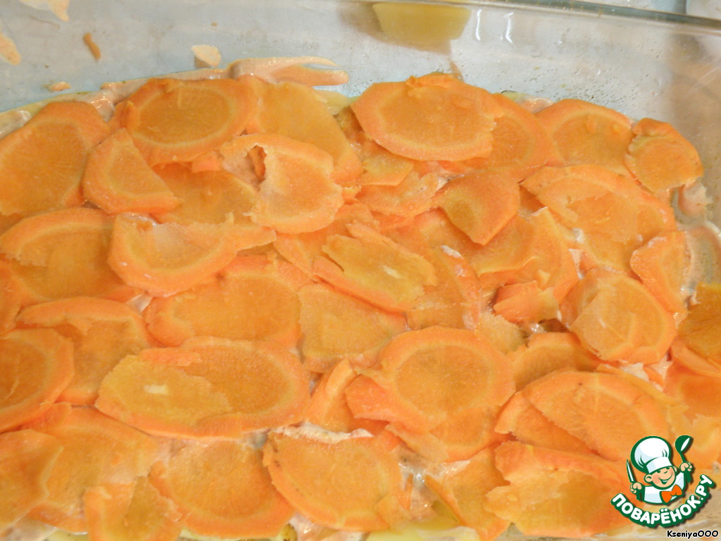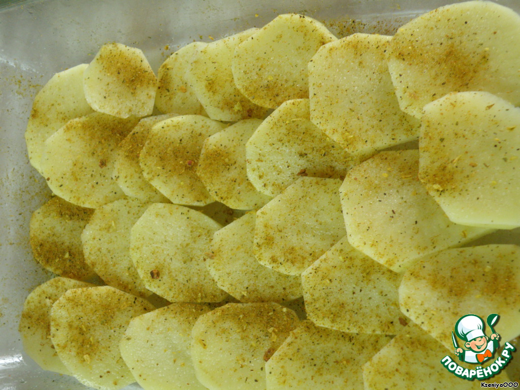 Первой кладем картошку, солим, посыпаем приправой по желанию, у меня была "Для блюд из картофеля", поливаем соусом.
