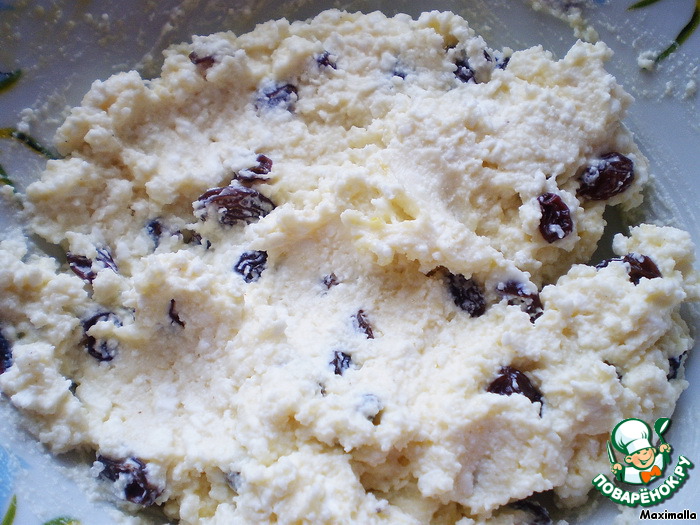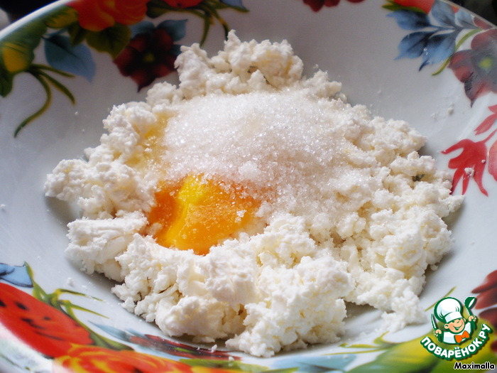 К нему добавим 2 ст. л. сахара, половинку яйца, ванилин и ложку сметаны.
