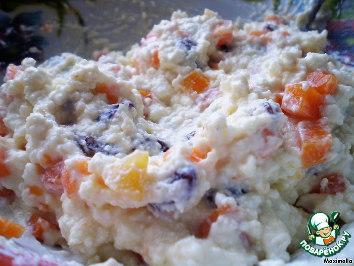 С тыквы сливаем воду и отправляем ее к творогу, перемешиваем.