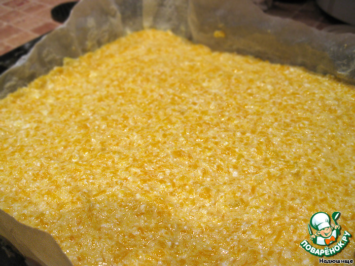 Но для запеканки нужен полуготовый тыквенный фарш, поэтому пропекаем ее немного дольше, чем обычно. Вынимаем из духовки, удаляем корку и режем большими ломтиками.
