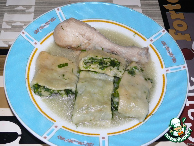 Когда окорочка готовы, заливаем их водой, солим и ждем, когда она закипит. За это время тесто тонко раскатываем, посыпаем зеленью, слегка солим. Скатываем в рулетик и нарезаем на кусочки.Выкладываем их в сковороду и варим минут десять.