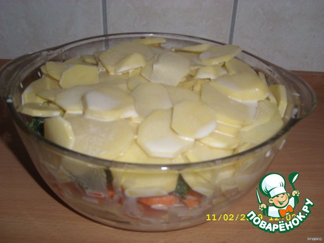 Овощи режем кружочками, картошку солим, смешиваем со сметаной.