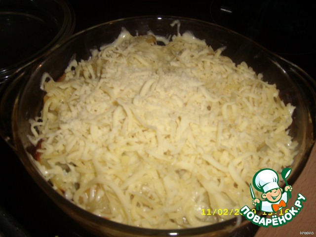 Запекаем в духовке до готовности, посыпаем тeртым сыром и допекаем, пока сыр не расплавится.