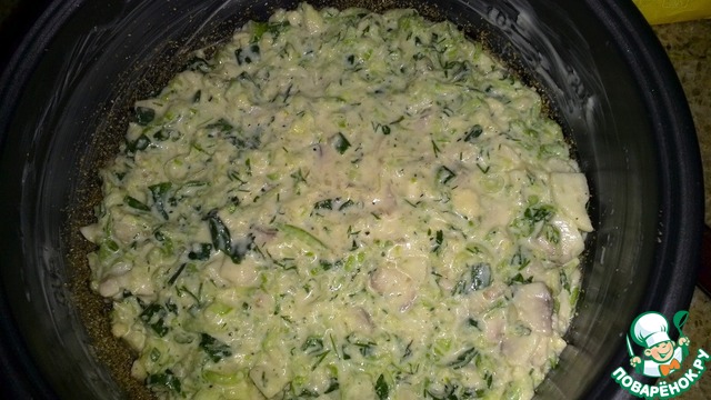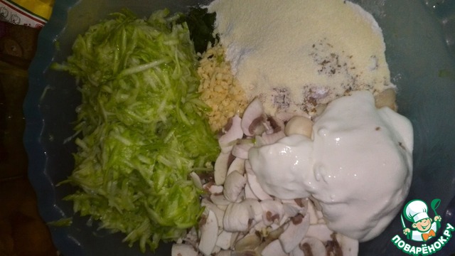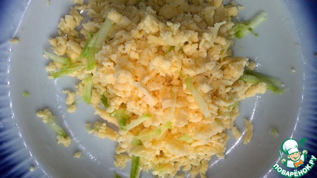 Всё смешиваем в одной посуде, в том числе и отжатый от сока кабачок потёртый. Если нужно можно подсолить, но с учётом того что сыр тоже солёный.