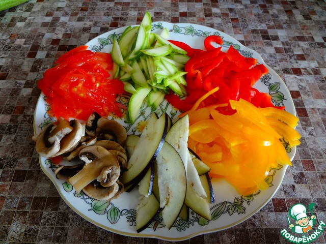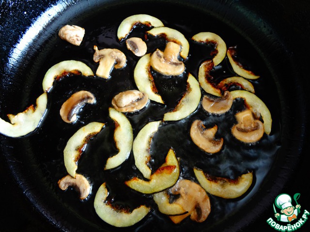 Все овощи кроме баклажанов и грибов немного обжарить на растительном масле.