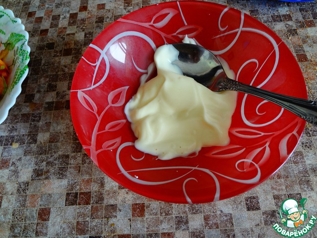 В чашку положить 2 ст. л. постного майонеза. Можно купить в магазине, можно и самим сделать. Рецептов в интернете много, останавливаться на этом не буду.