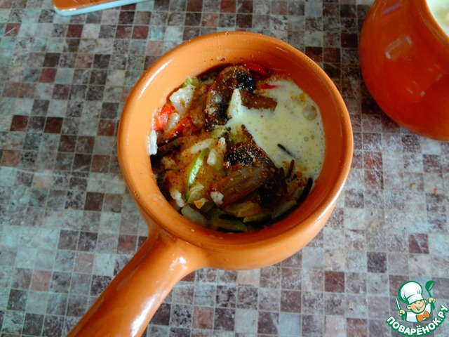 Сложить в кокотницу рис с овощами. Сверху положить красивые грибочки и залить овощным бульоном с майонезом.