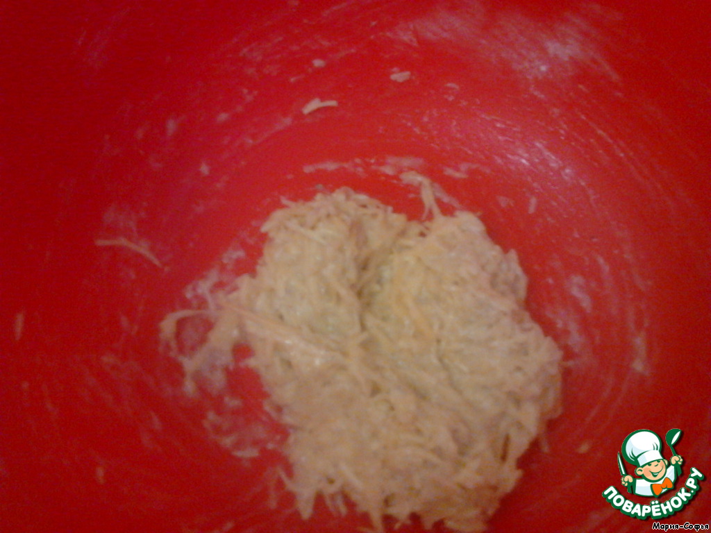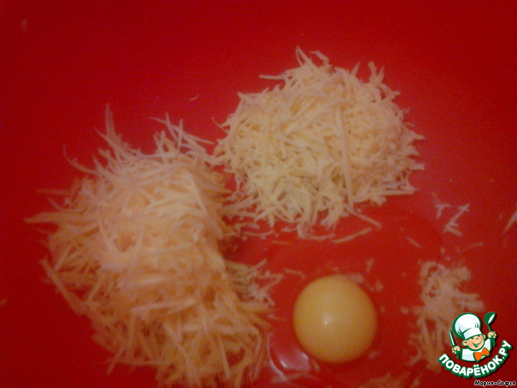 Сыр, тыкву натереть на терке, добавить яйцо, муку, соль, перец.