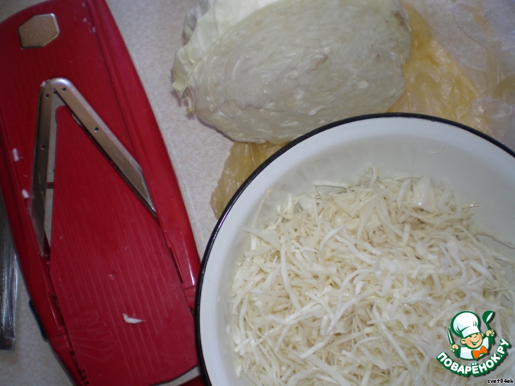 1. Нашинкуем капусточку и немного перетрем ее с солью, чтобы была более податливой.