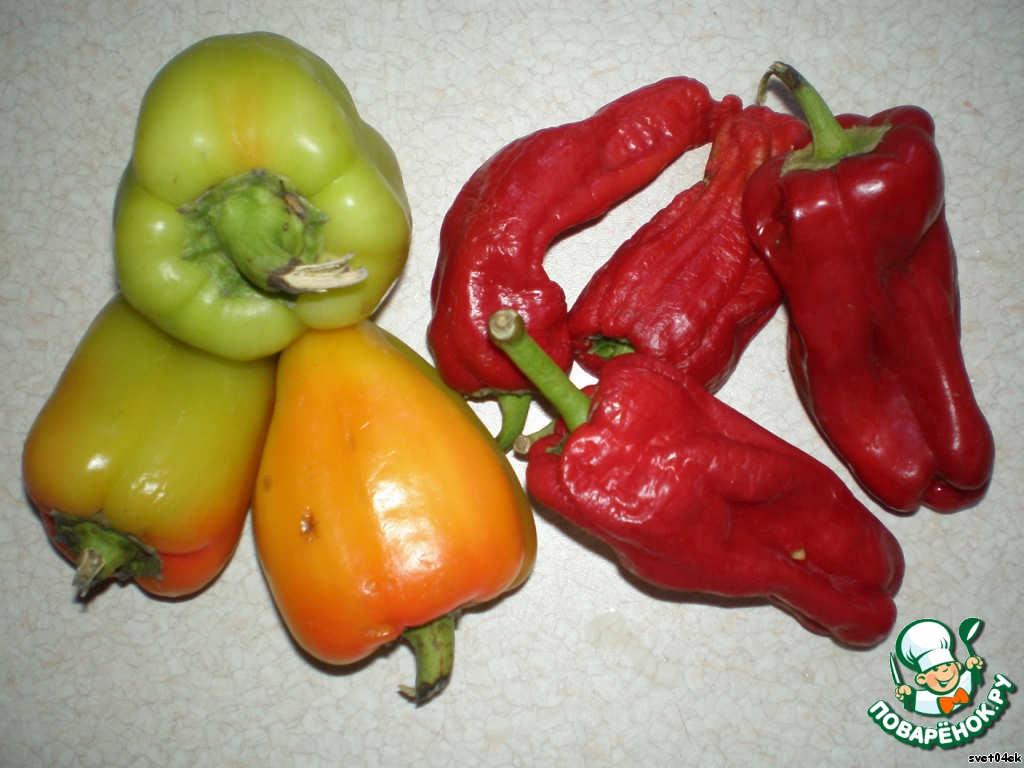 2. Берем перчики, моем, чистим. У меня были обычные болгарские перцы и перцы от свекровушки, из которых наши бессарабские болгары делают паприку, называется он пепер, он очень ароматный, но тоненький)))