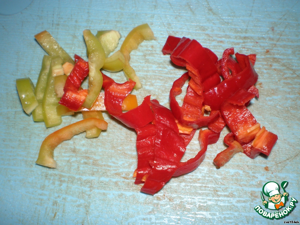 3. Перец нарезаем любимым размером и формой))) Я особо не заморачивалась и нарезала полосочками!