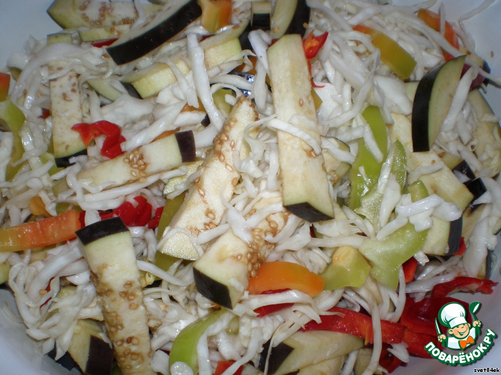 5. Соединяем капусту, перец и баклажаны, ручками аккуратно перемешиваем, чтобы овощи равномерно распределились в капусте.