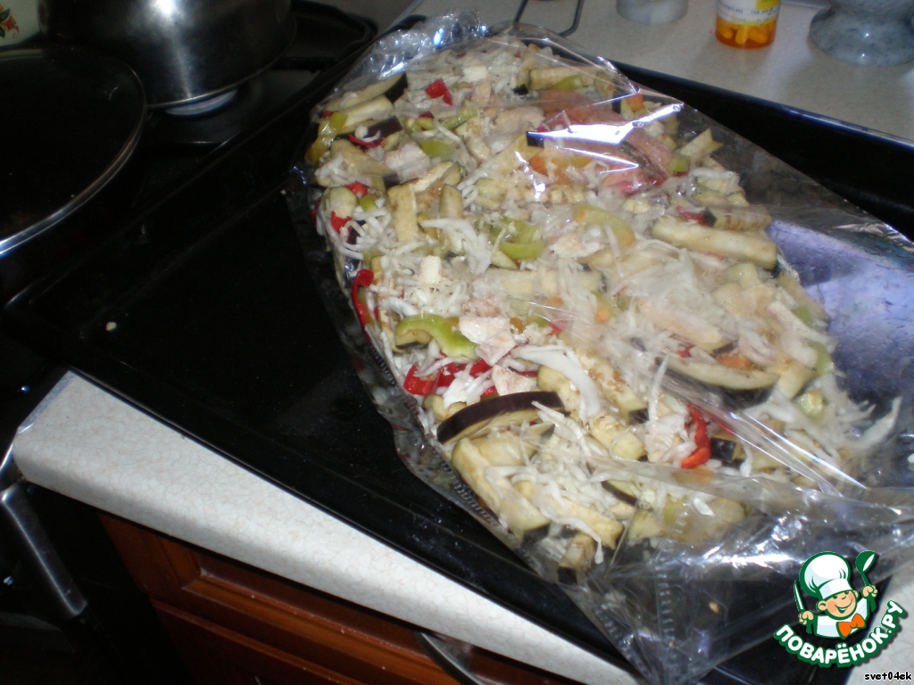 7. Теперь капусту с овощами выкладываем в рукав, делая подушку для мяса,