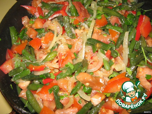 Зеленая фасоль, запеченная с яйцами и помидорами