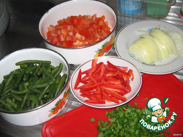 1. Все овощи порезать. Болгарский перец – соломкой, лук – полукольцами, помидоры – кубиками, петрушку порубить. Фасоль отварить в подсоленной воде, следить, чтобы она оставалась тверденькой и обязательно после того, как вы сольете воду, промыть фасоль холодной водой, иначе она может потерять цвет.