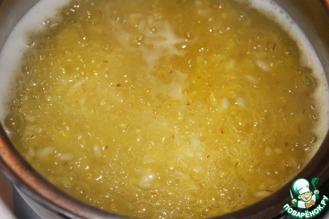 Во вторую половину белого риса в подсоленную воду добавляем рыльца шафрана