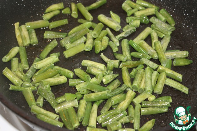 После цуккини чуть обжариваем стручковую фасоль, присаливаем, перчим и взбиваем ее в блендере и протираем через сито (забыла сфотографировать)